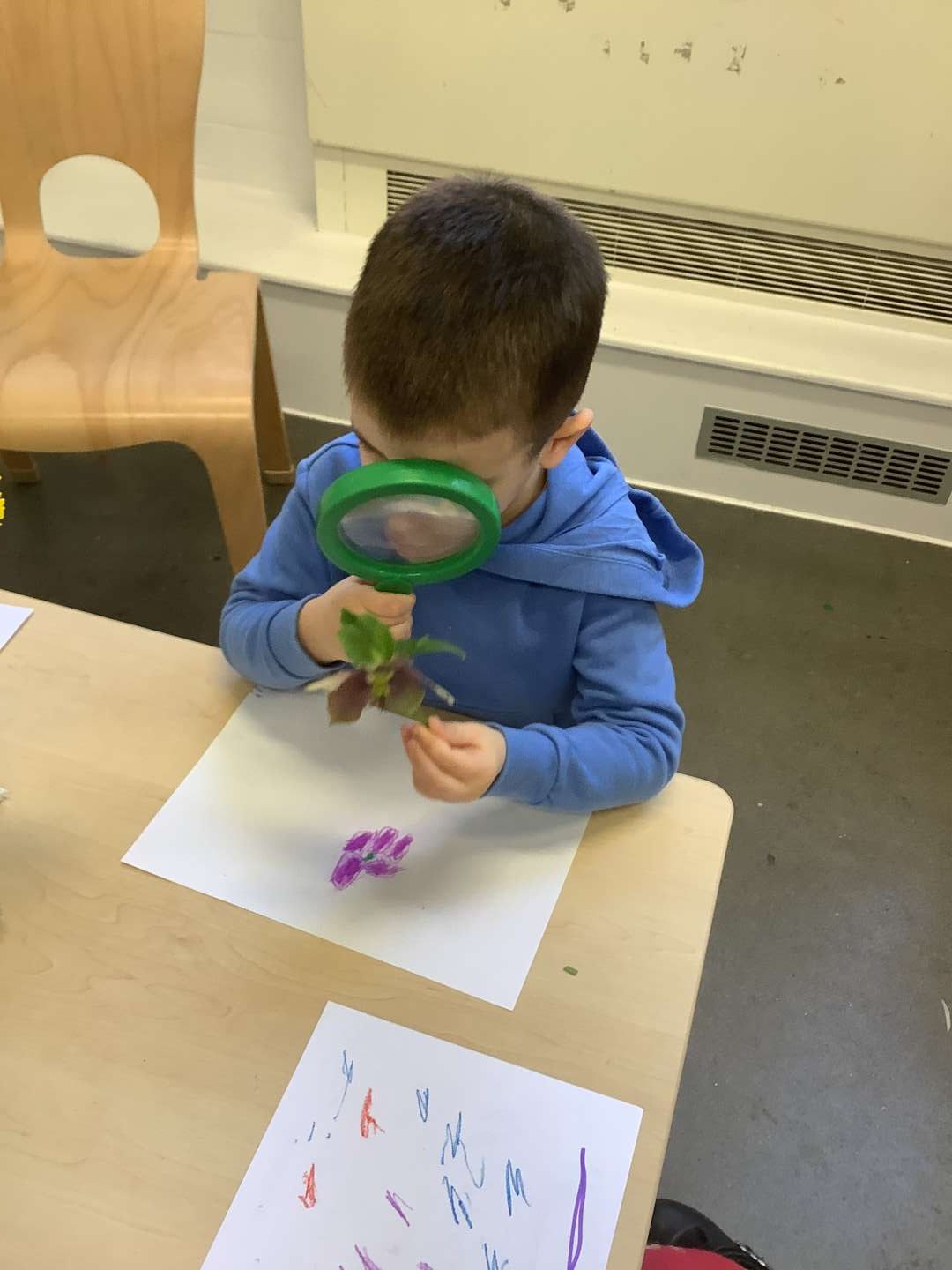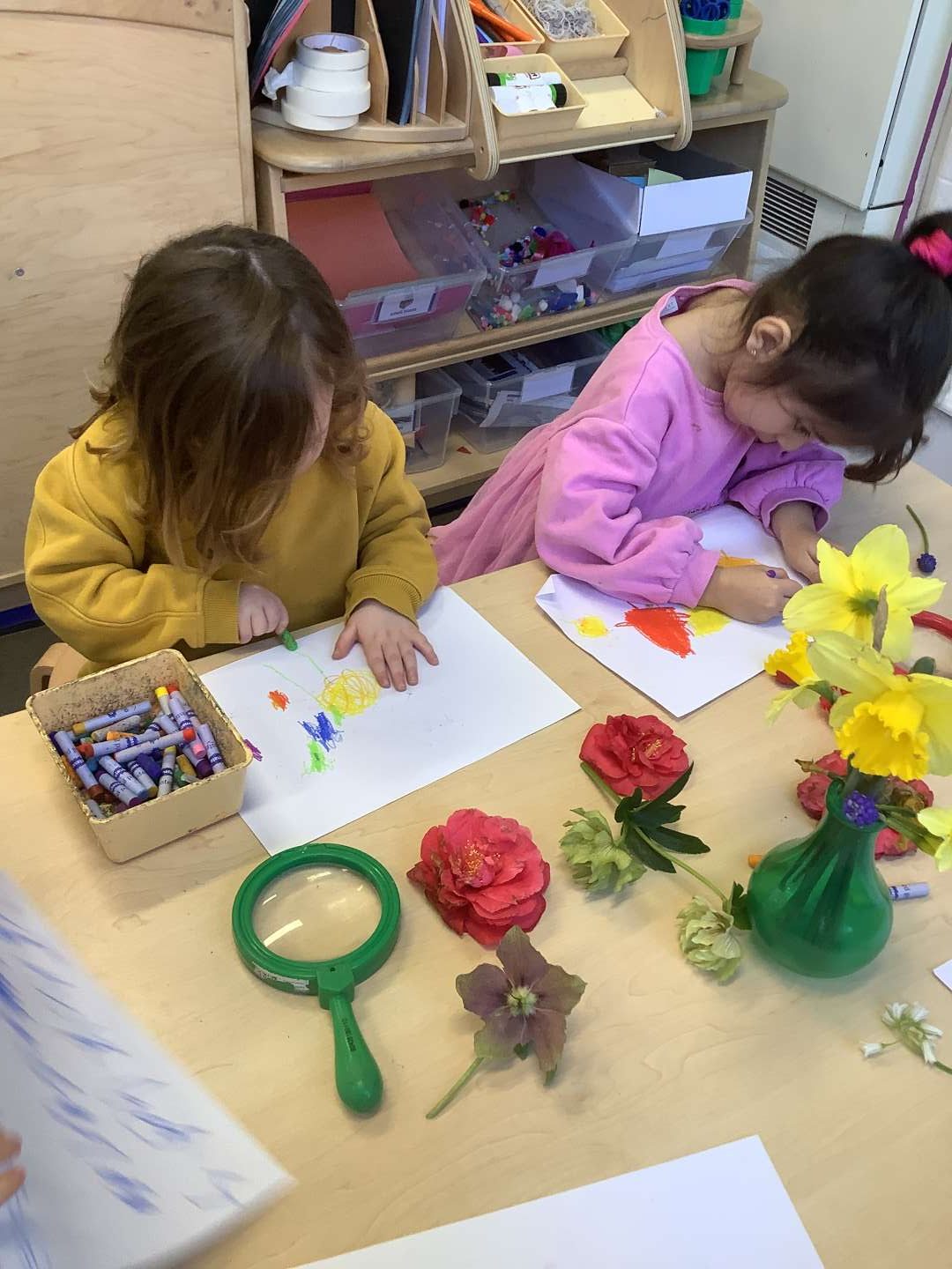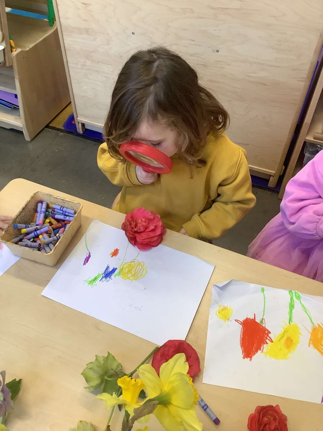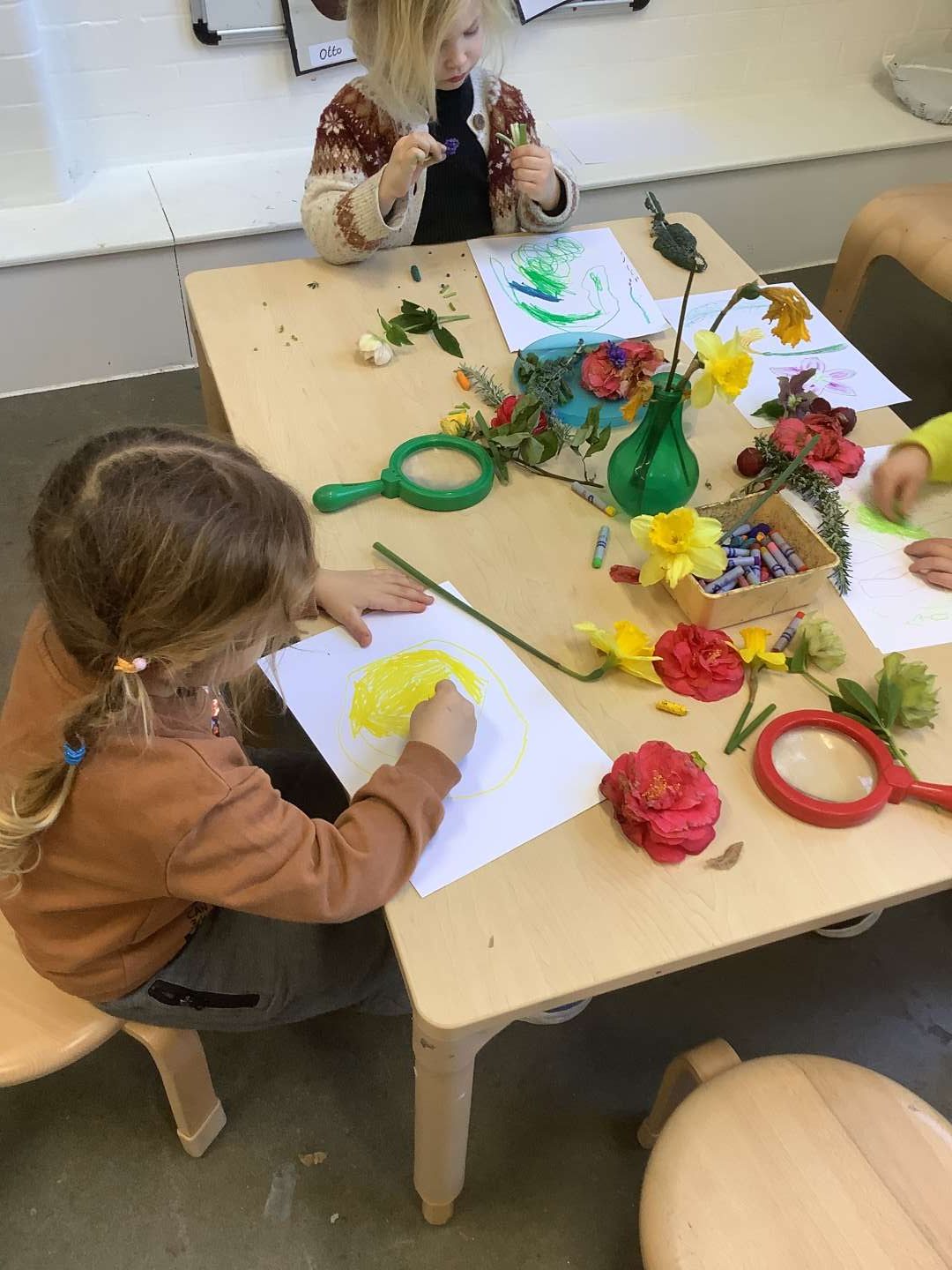 Olive class has been studying our artist of the term, Hannah Borger Overbeck and drawing observational art of flora like hers with pastels. Sonya brought in some daffodils, camellias, muscari and hellebore flowers and we used the magnifying glass to look at the details and then drew them.